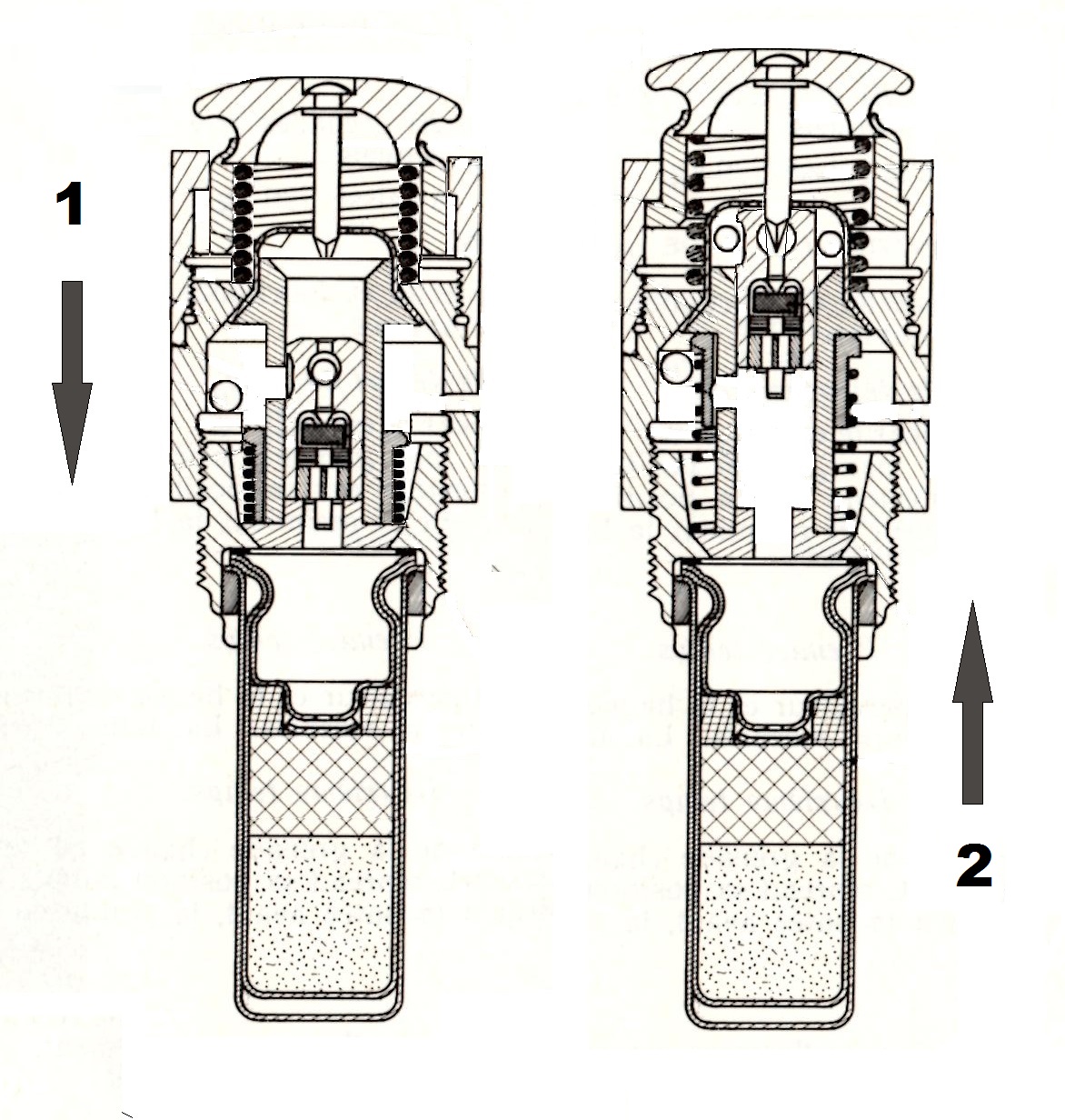 La fusée est sécurisée par une goupille passant dans les spires du ressort de la bague d'armement qui doit être retirée avant lancement. Le système d'armement se compose d'un percuteur et d'une bague d'armement tous les deux maintenus en position avant sous l'action de leurs ressorts. Avant le tir, la bague d'armement maintient la bille d'armement dans son logement et bloque le porte amorce loin du percuteur. Au départ du coup (1), le percuteur et la bague d'armement reculent par inertie en comprimant leurs ressorts. La bille d'armement s'échappe de son logement. Dès que l'acélération de la grenade change de sens (2), le percuteur sous l'action du ressort reprend sa position initiale. Le porte amorce avance par inertie jusqu'à la butée avant, la pointe du percuteur écarte les billes de sécurité. A l'impact la percussion de l'amorce est assurée par refoulement du percuteur et par déplacement du porte-amorce vers l'avant.