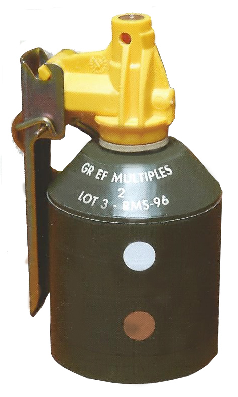 Elle peut être lancée à la main équipée d’un allumeur type 1728A ou projetée par un lanceur type 1663 avec un moteur type 0531. Marquage en blanc: GR EF MULTIPLES - 2 - (N° lot - RMS - Année). Deux pastilles de couleur selon les effets.