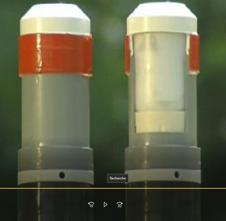 Son corps est en plastique polyéthylène élastomère cylindrique d'un diamètre de 56 mm et se différencie des précédentes par son couvercle marron, aplatie sur le bout et sertie d’un adhésif bleu ciel ou rouge.