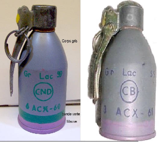 Elle comprend un corps corps de forme cylindro-ogivale en fer blanc avec un fond serti. Son poids total est de 255 g avec un chargement composé de 80 g de produit lacrymogène CN2D ou CND ou CB. Elle est amorcée au moyen d’un bouchon-allumeur automatique Mle 1935, à détonateur et à retard de 2 secondes. Ces caractéristiques sont identiques à la précédente ainsi que le conditionnement en caisse.