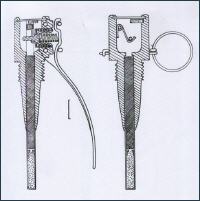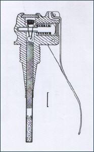 Il pèse 90 g et comprend un corps tubulaire en alliage de plomb et d’étain (1) dans le lequel est disposée une mèche fusante d’un retard de 5 à 6 secondes (2) et au bout duquel est serti un détonateur N°7 (3) sur une bague de calage (4). La tête du bouchon présente une cavité élargie qui est fermé par un couvercle serti (5) ; A l’intérieur de cette cavité, sont disposées deux amorces (6) de part et d’autre de la mèche fusante. Entre les deux amorces est monté un ressort (7) en forme de V dont les branches tendant à s’écarter de façon à venir percuter simultanément les deux amorces. Un verrou (8) qui traverse le couvercle du bouchon, s’engage entre les branches du ressort de percussion et les maintient en place.