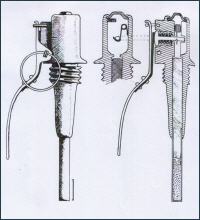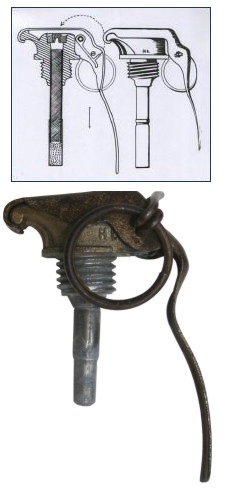Ce verrou est sollicité par un ressort (9) placé à l’intérieur du bouchon ; il est retenu par un levier de déclenchement (10) qui est agrafé, d’une part, à un tenon porté par le bouchon et qui est fixé, d’autre part, au moyen d’une goupille de sécurité en forme d’épingle de sureté c'est-à-dire deux branches parallèles dont l’une s’agrafe sur l’extrémité de l’autre par un crochet (11) portant un anneau (12).