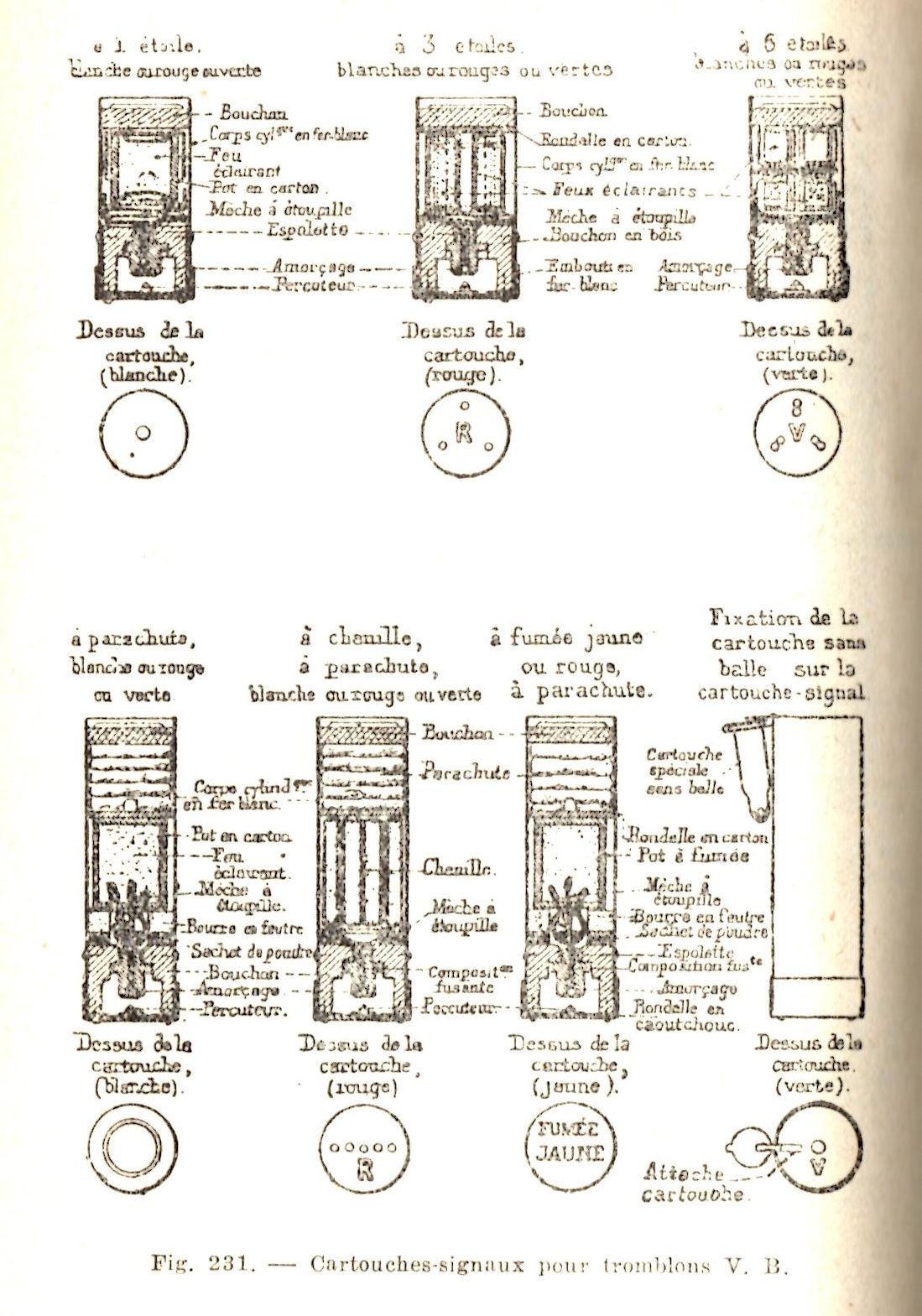 Les signaux sont à 1 étoiles, 3 étoiles, 6 étoiles blanches, rouges ou vertes sans parachute. Les signaux à parachute sont blanc, rouge, vert et à chenille de 5 feux blanche, rouge, verte. Il existait également un VB à parachute de fumée jaune ou rouge uniquement visible de jour.